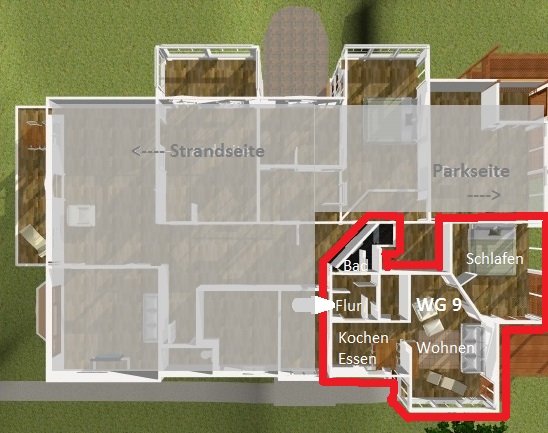 Das Appartement unter dem Dach mit dem Blick auf das Meer und in den Park. Übersichtlich mit allem Komfort.